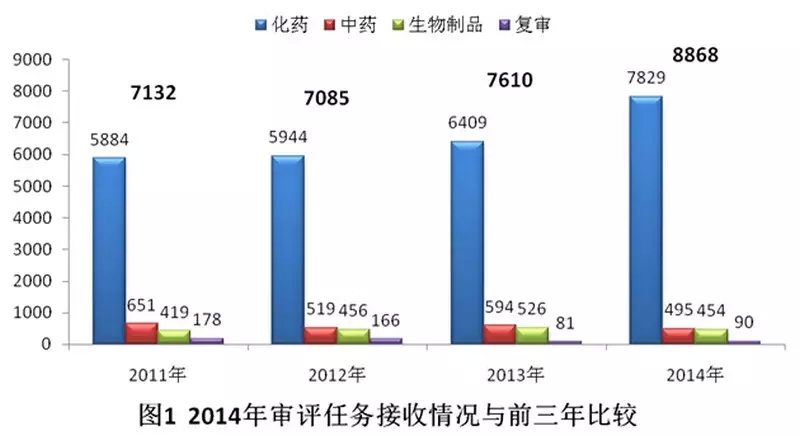 2014年,藥審中心接收新的注冊申請8868個(以受理號計,下同)。與既往年度接收注冊申請的比較情況見圖1。