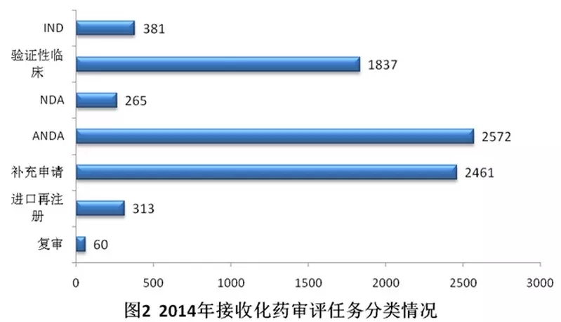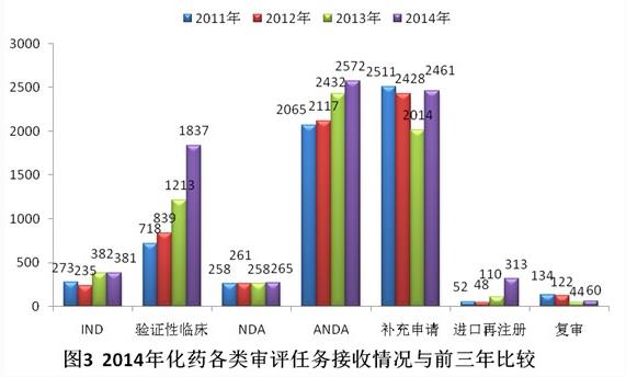 2014年化藥審評任務(wù)接收量增加明顯,較2011-2013年年均化藥審評任務(wù)接收量增幅近30%,占年度審評任務(wù)接收總量近90%;中藥和生物制品審評任務(wù)的接收量均有所下降。