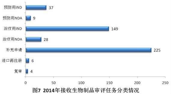 2014年共接收生物制品注冊申請458個,其中補(bǔ)充申請占49.1%,治療用生物制品IND占32.5%。具體見圖7。