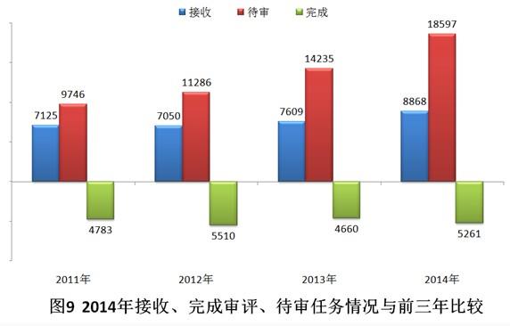2014年,藥審中心共完成5261個注冊申請的技術(shù)審評,比2013年的審評完成量增加了12.9%,但接收任務(wù)量較2013年增加了16.5%,待審任務(wù)積壓量進(jìn)一步增加。2014年接收、完成審評、待審任務(wù)情況與前三年比較見圖9。