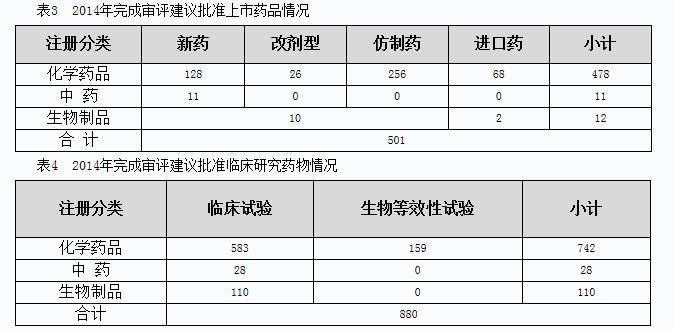 2014年,藥審中心完成審評建議國家總局批準(zhǔn)上市和批準(zhǔn)臨床研究的情況見表3、表4。