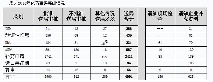 2014年化藥完成審評并呈送總局審批的注冊申請共4091個,另有完成審評通知現(xiàn)場檢查的注冊申請156個,完成審評通知企業(yè)補(bǔ)充資料的注冊申請625個。具體情況見表5。