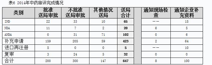 2014年中藥完成審評并呈送總局審批的注冊申請共647個,另有完成審評已通知現(xiàn)場檢查的注冊申請8個,完成審評通知企業(yè)補(bǔ)充資料的注冊申請100個。具體情況見表6。