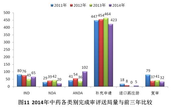 有明確審評結(jié)論的注冊申請中,建議批準(zhǔn)的2960個,建議不批準(zhǔn)的842個,總體不批準(zhǔn)率為22.1%。與2013年比較,2014年化藥除復(fù)審?fù)飧黝悇e完成審評送局量均有所增加。2014年化藥各類別完成審評送局量與前三年比較情況見圖10。