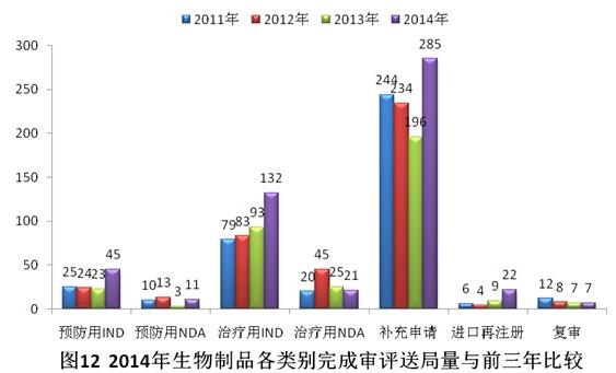 與2013年相比,2014年生物制品除治療用NDA外,其他各類審評任務(wù)接收量均有所下降。具體見圖8。
