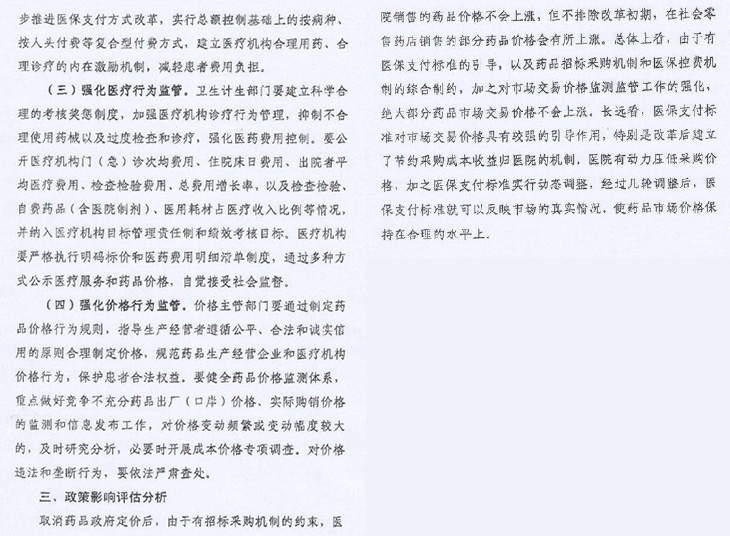 取消藥品政府定價后,由于有招標采購機制約束,醫(yī)院銷售藥品價格不會上漲。但不排除改革初期,零售藥店銷售部分藥品價格會有所上漲??傮w來看,由于有醫(yī)保支付標準引導(dǎo),以及招標采購機制和醫(yī)保控費機制綜合制約(價格放開后未來主要價格管理應(yīng)由衛(wèi)計委和醫(yī)保部門負責),加之對市場交易價格監(jiān)測監(jiān)管強化(物價部門主要職責是加強市場監(jiān)管)。絕大部分藥品市場交易價格不會上漲。長遠看醫(yī)保支付標準對市場交易價格有較強引導(dǎo)作用。特別是建立節(jié)約采購成本收益歸醫(yī)院機制,醫(yī)院有動力壓低藥價,加之醫(yī)保支付標準實時動態(tài)調(diào)整,經(jīng)過幾輪(壓價)調(diào)整后,醫(yī)保支付標準就可以反映市場真實情況。使藥品市場價格保持在合理水平上。